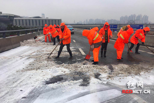 从25日晚上开始,长沙降雪不止并夹带冰雹。26日凌晨,东山街道辖区范围内香樟路、红旗路、花候路等多条通往高铁南站的主次干道因冰雪造成路面湿滑,道路拥堵,给人们出行带来不可预计的安全隐患。眼下时逢年关岁末,正是高铁南站的客流高峰期,多条通往高铁南站的主要道路如发生交通事故,造成道路不畅通,后果可想而知,必将影响整个高铁南站的正常运行秩序。