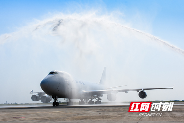 飞机穿过水门后,长沙-北美定期洲际全货机航线首航仪式也在长沙黄花国际机场停机坪举行。湖南省商务厅党组成员、省政府口岸办主任杨中万宣布“长沙-北美定期洲际全货机航线正式开通”,长沙市副市长邱继兴主持仪式,长沙经开区党工委书记、县委书记曾超群致辞。