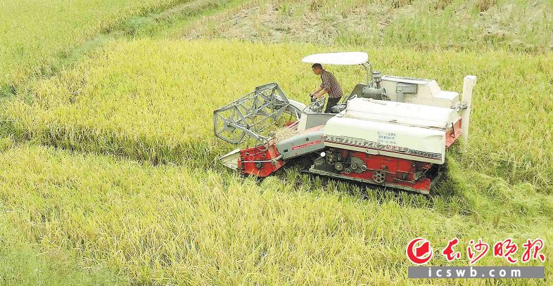 宁乡市灰汤镇,收割机正在田里收割早稻。