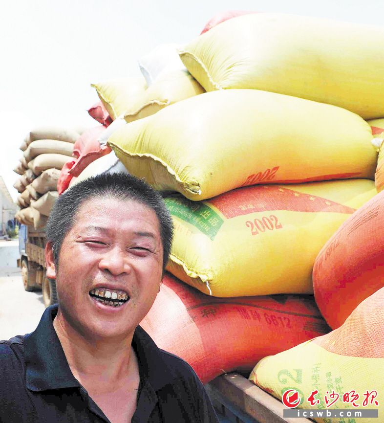 望城区,一名农民高兴地将自家的稻谷送到粮库。
