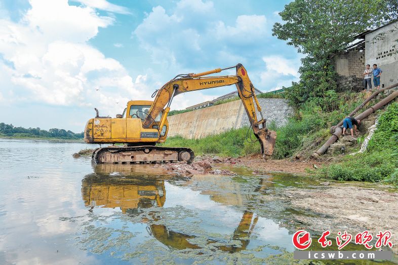 沩水河畔,一台挖掘机轰隆作响,其大臂上安装的钻头持续作业,钻裂河床上的岩石,挖出较深的水泵取水点。岸边土坡上,村民们挥舞锄头,为水泵电机挖出摆放位置。这是宁乡市坝塘镇油麻田村村干部带领村民疏通取水点、抢修水泵的劳作情形。