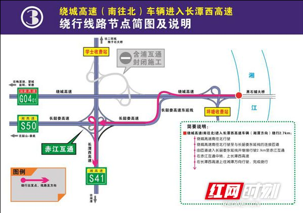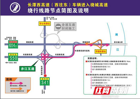原行经该路段的机动车需绕道含浦大道、象嘴路、学士路、岳麓收费站、绕城高速西南段、长潭西赤江互通等道路通行。