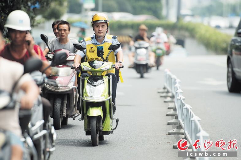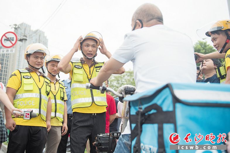 昨日中午12时27分,湘江中路南往北方向,一辆电动车闯入机动车道行驶被交警拦下。外卖小哥通过自己的着装演示提醒车主要佩戴护具。均为长沙晚报记者 黄启晴摄