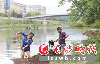 “最近都在忙着打捞河里的水草,一天捞的水草有几十吨。”澄潭江镇副镇长伍昶林告诉记者,这项工作已经开展了差不多两周,南川河澄潭江镇集镇段的水草清除了近七成。