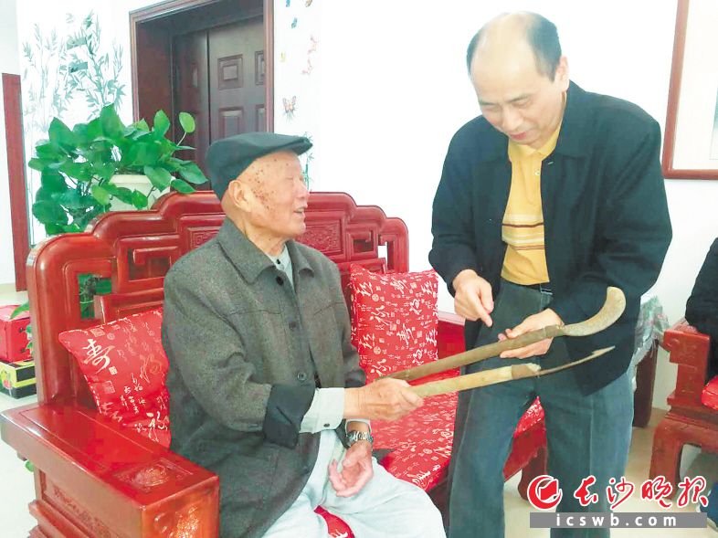 当日,记者随同长沙市委党史研究室的同志来到陈再仁家中,见到了那两把具有非同寻常“身世”的镰刀。听说陈老要向长沙党史馆捐赠镰刀,当年曾是陈再仁的部下、后来担任长沙市人大常委会副主任的邹水生老人也赶到陈老家中,热心向记者介绍情况。“他在生产队‘办点’的时候,同社员群众一样干,手拿镰刀跟群众一起割草垫牛栏、沤肥。他当县委书记,凡是要求干部做到的,都是自己先做出榜样。”邹老对那一段经历记忆犹新。