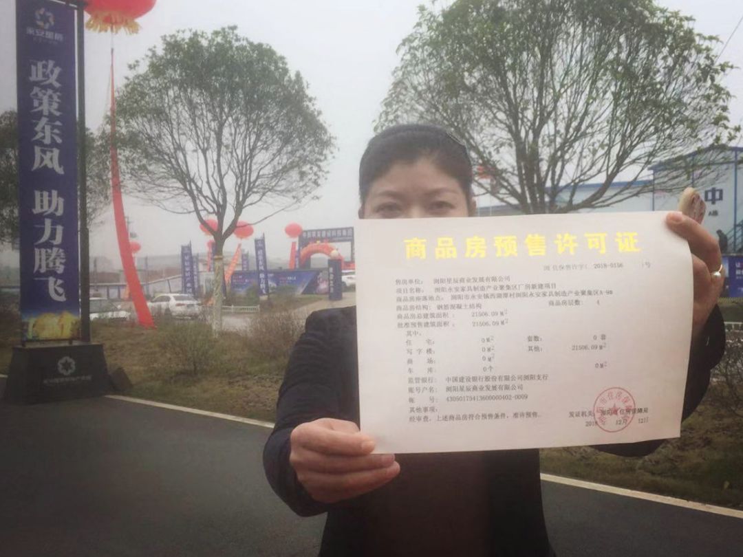 她是浏阳市永安家居产业园的副总经理。证书上“允许预售”的4栋工业厂房,就在这个园区内。12月23日,园区组织的家具行业交流会上,这张特殊的许可证被公开展示。