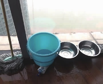 “这间次卧的飘窗是外凸的,由于顶层没有这一结构,相当于顶层,我们怀疑是防水没做好导致渗水。”记者在李女士的指引下看到,尽管当天并没有下雨,但次卧飘窗的玻璃缝隙中却不断有水渗出,顺着玻璃滑落下来,滴在木地板上。李女士不得不拿来桶子、盆子等接水。“你看咯,一个上午就有3厘米深了。”