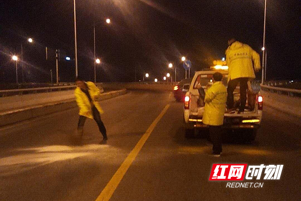 在岳麓区,城管对辖区内二环线、云栖路、岳麓大道、望月湖高架桥、咸嘉湖过江通道、全区地下通道及人行天桥等重要部位进行巡查,情况一小时一报告,巡查发现有轻微结冰现象,立即进行应急撒盐处理。