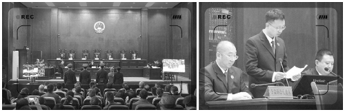 左:案件庭审现场;右:检察官作为公益诉讼代表人出庭