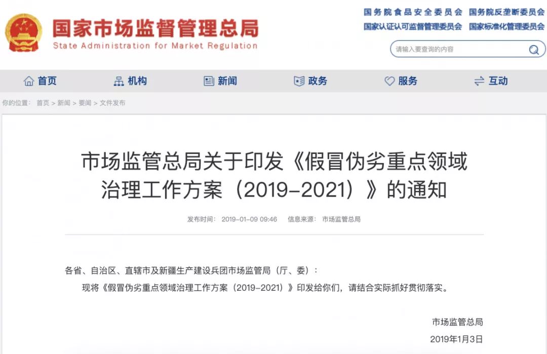 1月9日,市场监管总局发布了市场监管总局关于印发《假冒伪劣重点领域治理工作方案(2019-2021)》的通知(以下简称通知)。