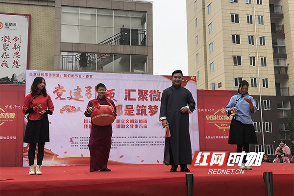红网时刻长沙1月14日讯(记者 胡芳 通讯员 肖海群)“党员干部要带头,摒弃陋习争上游,婚丧嫁娶要报告,要做到……”台上,居民群众自编自演倡导移风易俗的三句半正在上演,诙谐幽默的表演赢得了阵阵掌声。1月12日上午,以“唱响新时代 梦圆千万家”为主题的2019全国社区网络春晚新聚园专场在长沙同升街道举行。