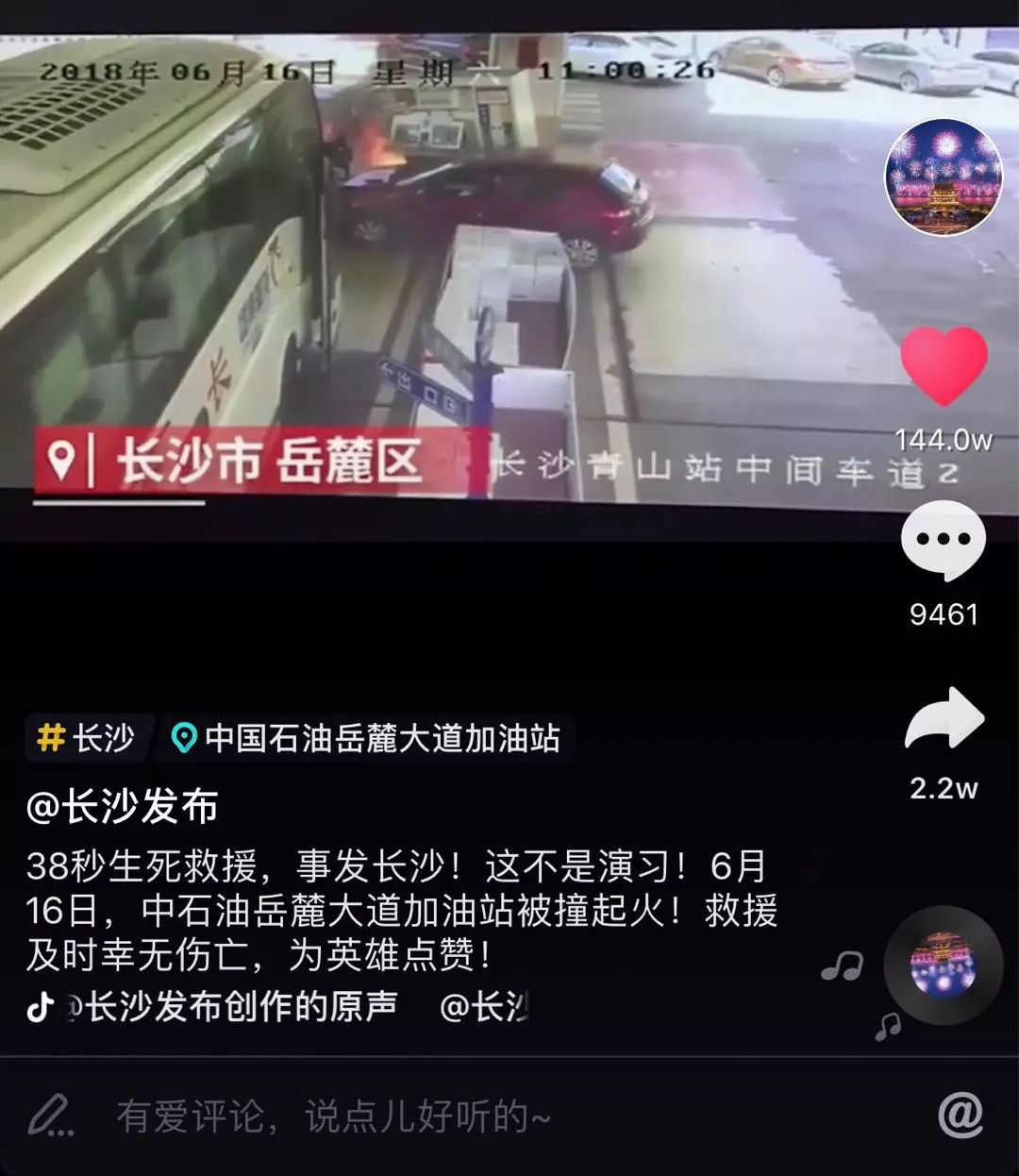 2018年,中石油岳麓大道加油站的惊魂38秒,可能是长沙市民难以忘记的一件“大事儿”。6月16日11时0分22秒,中石油岳麓大道加油站内,一台小汽车突然转弯加速将4号加油机撞倒,并立即起火,火苗2米多高,站内共有排队加油车辆30余台、各类人员100余人,一旦发生爆炸,后果不堪设想。危急时刻,7名加油站员工快速而有序地开展扑救,38秒,化险为夷。
