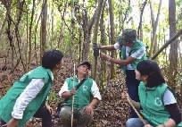 ▲去年,陈圣友(左二)和其他志愿者一道披荆斩棘、爬山涉水 ,参与穿山甲有关的野外科考和保护活动。
