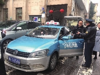 2月21日,长沙市交通行政执法局工作人员在火车站附近开展执法行动,检查出租车驾驶员证件及打表情况。记者 石芳宇 供图