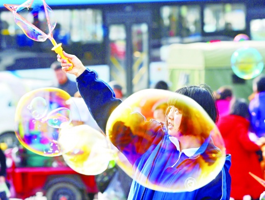 图④ 长沙市开福区秀峰山公园,市民在阳光下玩泡泡。