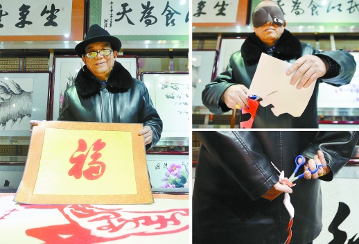 2月26日,长沙市雨花区雨花非遗馆,剪纸艺术家洪源展示他的剪纸作品和技艺。今年68岁的洪源是攸县人,2002年,在上海凭借一刀剪出面积400平方米的一个龙字,创造了吉尼斯世界纪录。洪源一把剪刀玩得溜溜转,大字可剪上千平方米,小字可剪1平方厘米,1字、10字、一首诗均可一刀剪成,盲剪、背后反剪均游刃有余。今年,他参加中央一台《挑战不可能》节目时,30副对联,全部盲剪出来。