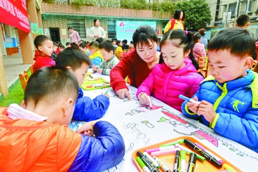 3月18日,长沙市天心区坡子街街道楚湘社区,小朋友在十米长卷上绘制环保主题画。当天,该街道开展“践行生态文明,建设和谐家园”主题宣传活动,社区居民和孩子们一起参与环保宣传和环境清洁,倡导从身边小事做起,打造天蓝、地绿、水净的良好生态环境。