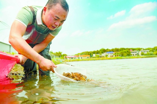 4月8日,宁乡市回龙铺镇泉福村,农户在水稻田投放虾苗。近年,长沙市在辖区推广“水稻+虾+鱼+泥鳅”等多种生态种养,助农户多元增收。目前,长沙市“水稻+虾”综合种养面积8万亩左右,每亩年增收4200元以上。