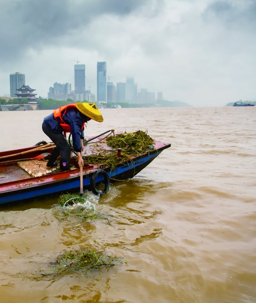 4月29日,湘江长沙市天心区杜甫江阁段,环卫工人在江面清理垃圾。去年以来,天心区市容环境卫生维护中心全面落实河长制工作,通过无人机巡查、巡逻艇打捞和河滩保洁等举措,对32.5千米的湘江河段进行清理维护,确保江清岸美。