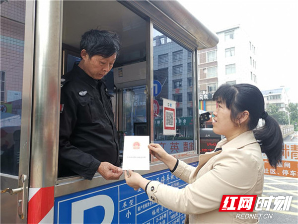 金桂社区文明志愿者向岗亭安保人员发放《长沙市文明行为促进条例》。