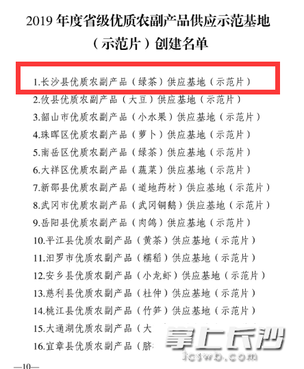 同时,长沙县优质农副产品(绿茶)供应基地入选2019年度省级优质农副产品供应示范基地(示范片),省级财政将对认定的湖南省优质农副产品供应示范基地(示范片)每个支持1000万元。