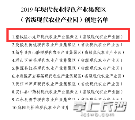 同样幸运的,还有望城区小龙虾现代农业产业集聚区,该单位入围的是2019年现代农业特色产业集聚区(省级现代农业产业园)。(钱娟)