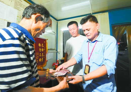 6月11日傍晚,长沙市101线公交车碧沙湖总站,公交司机龙文华(右)将拾到的钱包交还给失主钟先生(左)。当天下午,龙文华驾车抵达终点站德汇路口时,发现座椅上有一个旧钱包,里面装满了人民币。因无法联系失主,他立马向车队报告。失主随后通过114联系上车队。失主钟先生是娄底人,身患重病,来长沙医治。遗失的钱包里有1万多元用于治病的钱以及银行卡、身份证等物。“救命钱”失而复得,钟先生感动不已。(田超黄建军)