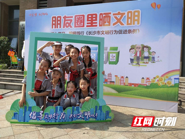 活动现场来自辖区内东屯小学的一名小学生看到宣传展板后主动地问道:“老师,能不能帮我们在这个可爱的框框里面也拍一张呀,发个我们的爸爸妈妈,让他们发个朋友圈,晒晒文明行为。”老师竖起了大拇指,给他们拍起了美美的照片,在志愿者的倡导和带领下,居民们纷纷来拍照发朋友圈,一起来倡导文明行为,对不文明的行为说“不”,让身边更多的居民熟知《长沙市文明行为促进条例》的相关条款,现场志愿者还发放《条例》100余本,还对与居民生活息息相关的进行简单讲解,如不占用公共区域、楼道内堆放私人物品、高空抛物等。