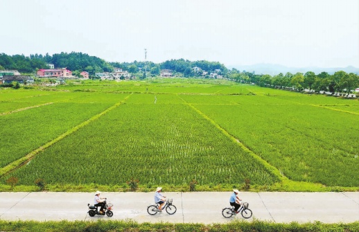 7月3日,宁乡市灰汤镇,村干部骑着单车、电动车下乡。