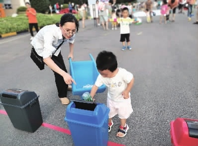 7月21日下午,一场以“垃圾分类,全家总动员”为主题的环保宣传活动在长沙市洪雅社区举行。活动现场,社工装扮成四色人偶垃圾箱,与萌娃们进行垃圾分类互动游戏;萌娃们也不甘落后,穿上自己做的“韭菜袍”等登台走秀,赢来阵阵掌声。(李成辉 丁岳云)