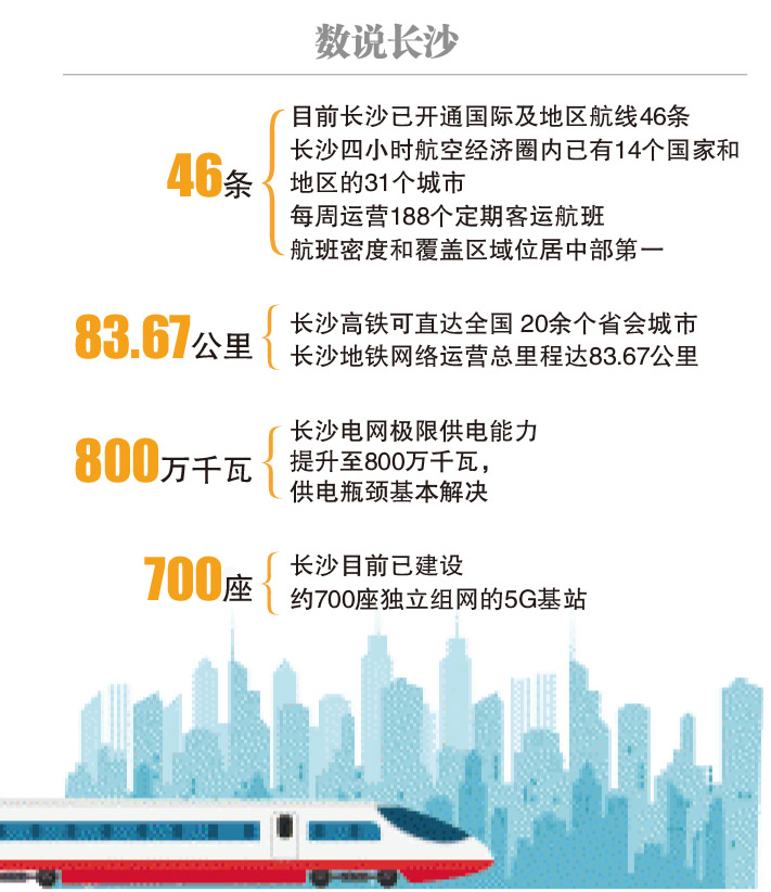 京广、沪昆两条高铁动脉在长沙交会,长沙高铁可直达全国 20余个省会城市,湘品从长沙新港上船可通江达海,运营总里程达83.67公里的长沙地铁网络让群众出行更加方便……水、路、空、铁立体交通网络的不断完善,让长沙与世界联系更紧密。