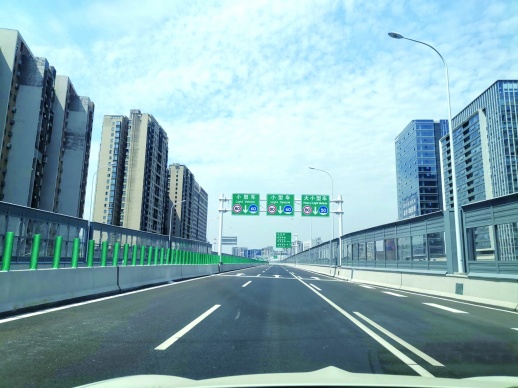 路面已经完成沥青铺摊,已施划标识标线,相关指路标识、电子抓拍设备也已安装到位。现场还有工作人员正在安装中央隔离护栏、隔音屏,以及对上下行匝道进行最后施工。