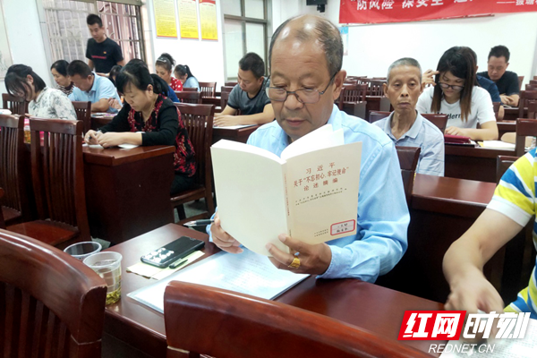 支部老党员学习《习近平关于 “不忘初心、牢记使命”论述摘编》。