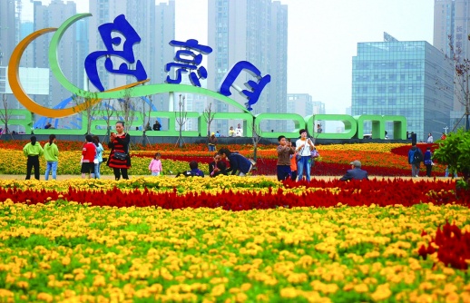 10月6日,长沙市新开放的月亮岛百花芬芳,游人如同置身在美丽的春天里,争相拍照留念。(覃仁岗)