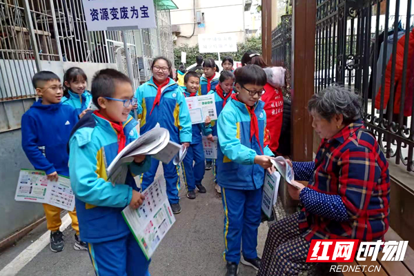 孩子们开展垃圾分类宣传、发放宣传资料。