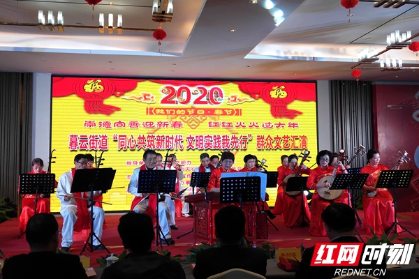 在随后进行的文艺汇演中,暮云街道的居民们为大家献上了一场精彩纷呈的文化盛宴,有积极向上的健身舞蹈《云塘之歌》,有展现湖湘本土韵味的花鼓戏《蝶恋花》,还有表达绵延思念的《潇湘家书》等,缤纷多彩的节目赢得现场观众阵阵喝彩。“代代传承家文化,移风易俗常态化。婚丧简办治陋习,盲目攀比是恶习。花草树木亦生命,共创宜居新环境。”庆新春,倡文明,演出间隙还穿插了以云塘社区居民公约为主题的有奖问答,居民们积极互动,现场洋溢着喜庆、欢乐的氛围。