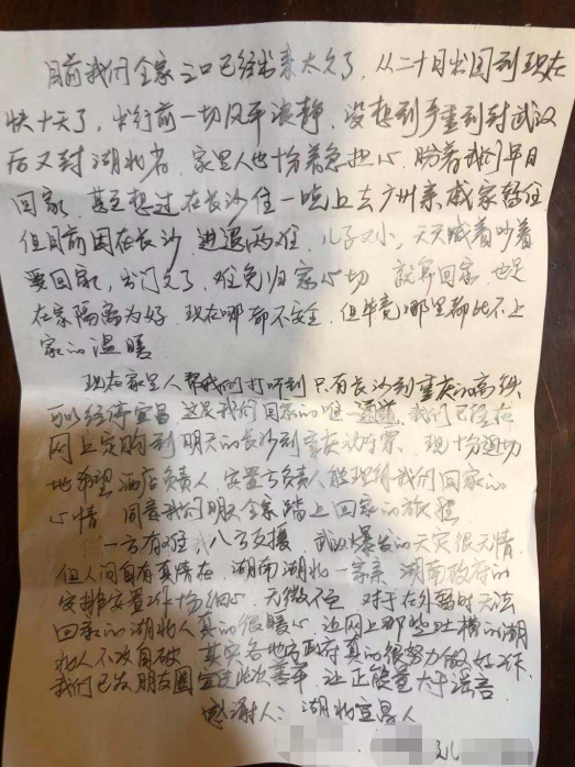 1月28日下午,长沙县对疫源地人员开放定点服务场所——长沙华天精选酒店的工作人员收到了一封暖暖的感谢信。感谢信中写道:“湖南湖北一家亲,湖南政府的安排安置工作十分细心、无微不至,对于在外暂时无法回家的湖北人真的很暖心!”感谢信最后署名:“感谢人:湖北宜昌人。”