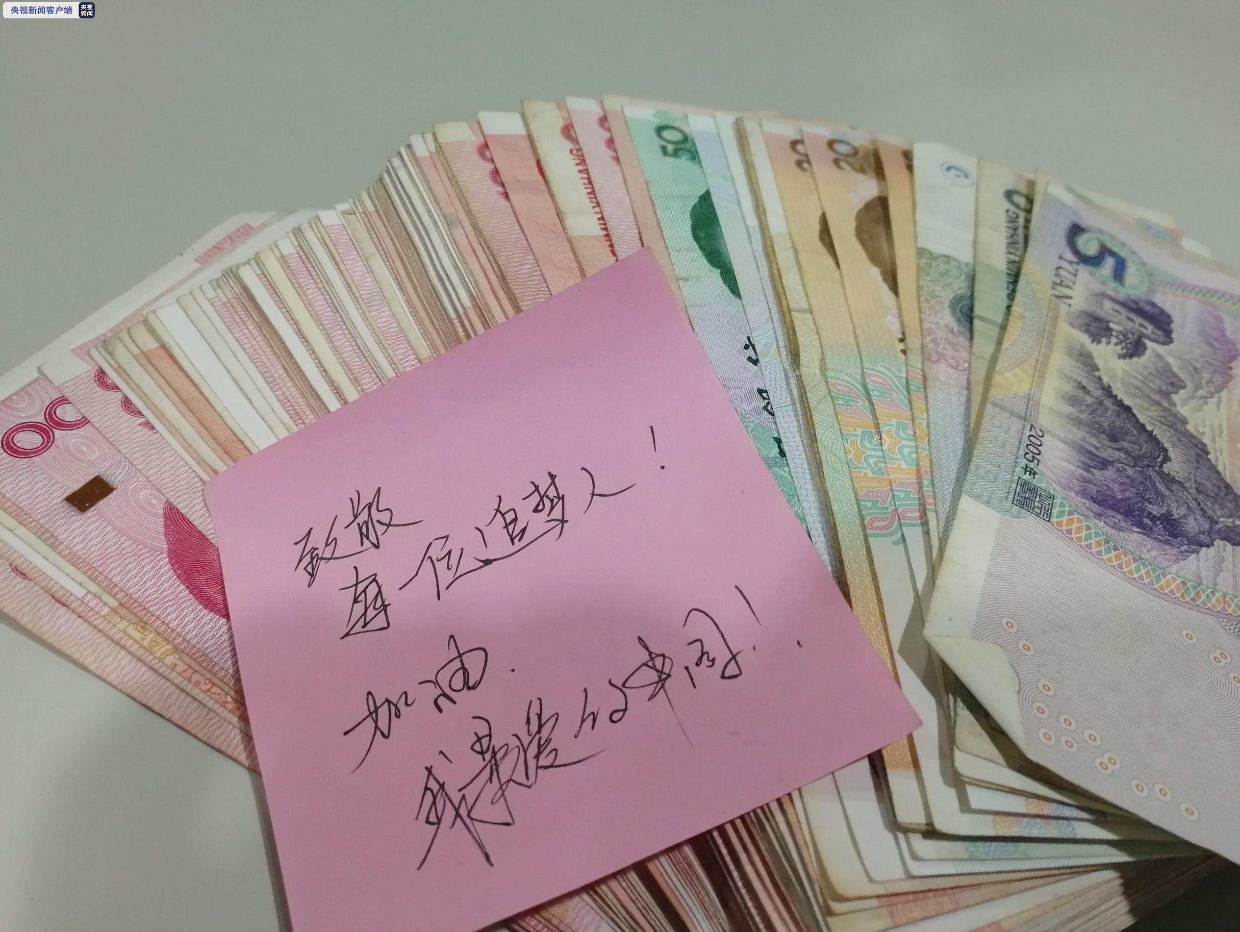 信封里面是一叠厚厚的人民币和一张便条,便条上面写着:“致敬——每一位追梦人!加油,我最爱的中国!”大家数了一下,里面一共是1万元人民币,其中三百元还是零钞,有五元的、十元的、二十元的、五十元的。