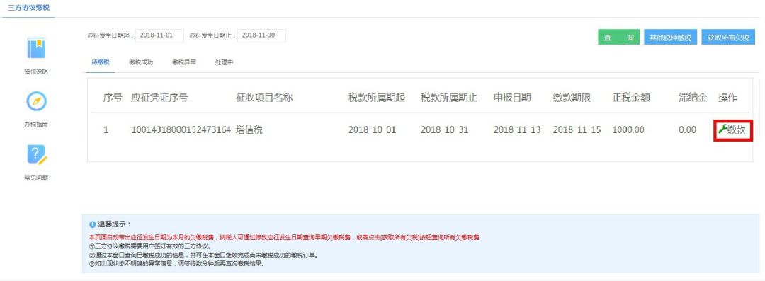 2.确认待缴税信息无误后,点击[确定]完成三方协议缴税操作;扣款成功后,可以在[缴税成功]中查询到此条缴税信息。