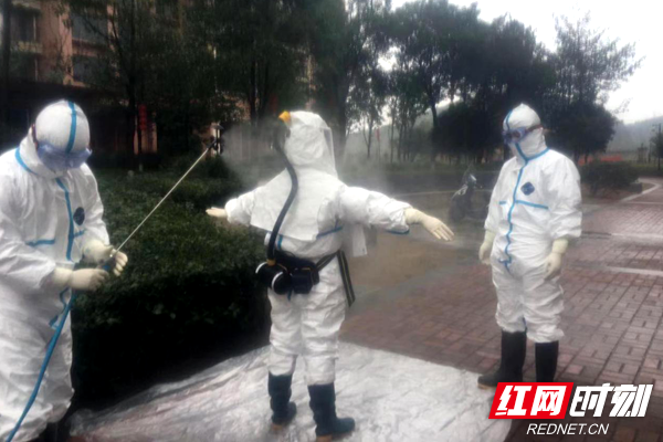 天心区疾控中心消毒队员帮助采样队员进行全身消毒。
