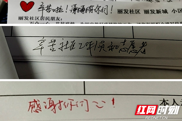 “辛苦啦!谢谢有你们!”“感谢你们!”“辛苦社区工作人员和志愿者!”采集回来的信息表上蓦然出现这样一句句暖心的话语,“很暖心,觉得所有的努力和付出都是值得的。”社区工作人员冯媛感动地说道,“一开始居民对疫情不是很了解,上户摸排总会听到一些质疑的声音,拒之门外也时有发生,经过我们线上、线下宣传,耐心细致地讲解,居民纷纷表示理解。”