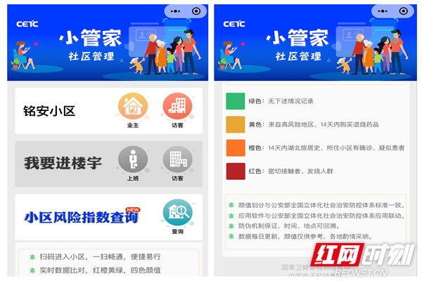 “小管家”是中电集团推出的一款人员动态信息管理的小程序,住户可以直接使用手机扫码,无接触式填报个人姓名、身份证号、住址、类型等信息,完成首次填报后,进行提交登记,系统将自动进行后台大数据实时比对,以红、橙、黄、绿四色提示用户个人动态信息,即:红(密切接触者、发烧人群)、橙(14天内湖北旅居史、所住小区有确诊、疑似患者)、黄(来自高风险地区、14天内购买退烧药品)、绿(无上述情况记录),形成电子通行证,显示绿色的进出人员每次只要配合体温检测和扫码,就可实现快速通行,其他人员就会第一时间进行核实。访客在完成首次登记后,每次还需登记访问住户信息,进行核查。