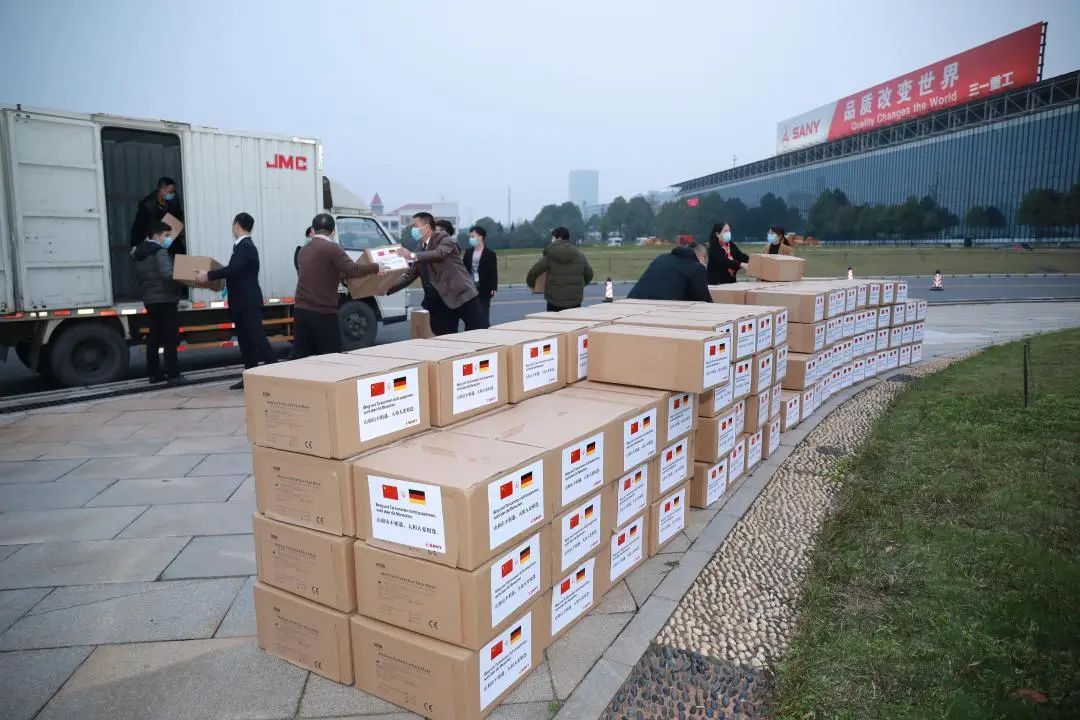 为此,工作人员连夜下单、联系物流、组织清关等。下午4点,首批防疫物资从生产线直接运抵三一厂区,争分夺秒装车发往德国。