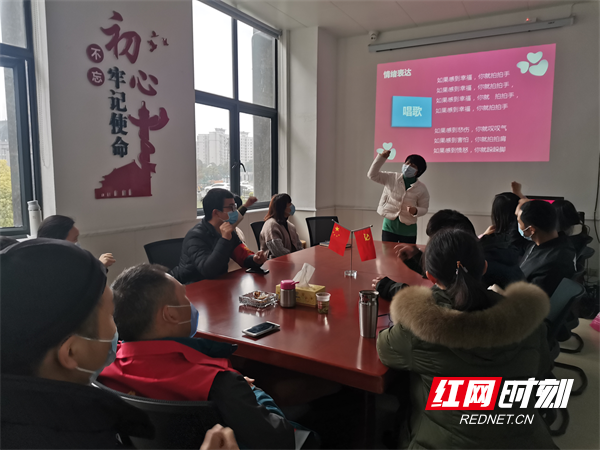 心理专家李卫老师带领湘绣社区工作人员做心理减压操。