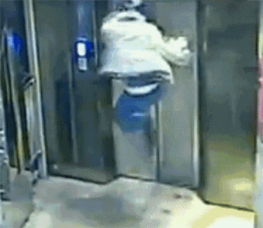盲区三:电梯外门和内门之间,电梯外门和内门之间,在电梯没达到时,是空的,是盲区。如果用力去顶撞,直接会发生如下情况——