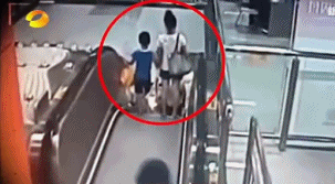 事故2:广东云浮,一个爸爸带着儿子做扶梯,儿子把脚放在电梯围裙板旁,被夹。