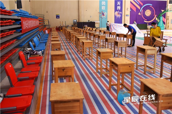 (长郡湘府中学在体育馆增设了学生用餐区。)