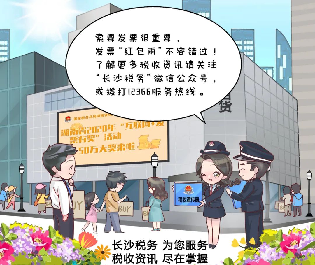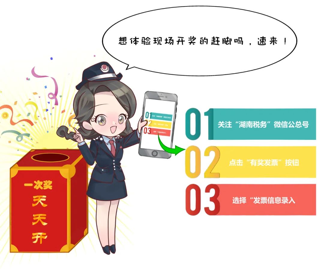 关注“湖南税务”微信公众号,点击公众号页面下方“有奖发票”按钮,选择“发票信息录入”后,扫描或填写正确的发票信息,即可参与一次抽奖,最高可获100元微信红包。