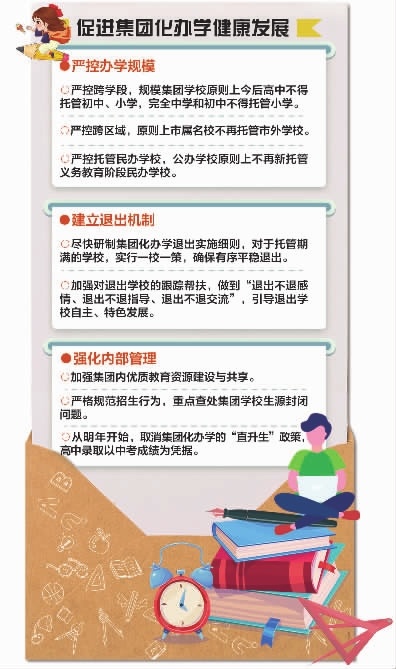 怎么落实?卢鸿鸣提出,一要严控办学规模。重点做到“三个严控”:严控跨学段,已经具备一定规模的集团学校,原则上今后高中不得托管初中、小学,完全中学和初中不得托管小学;严控跨区域,原则上市属名校不再托管市外学校,确有需要的,须经市委市政府审批同意;严控托管民办学校,公办学校支持民办学校办学须依据国家相关法律法规管理,原则上不再新托管义务教育阶段民办学校。二要建立退出机制。尽快研制集团化办学退出实施细则,明确退出条件、退出程序和工作要求,对于托管期满的学校,实行一校一策,确保有序平稳退出。加强对退出学校的跟踪帮扶,做到“退出不退感情,退出不退指导、退出不退交流”,引导退出学校自主、特色发展,成为群众认可的新名校。三要强化内部管理。加强集团内优质教育资源建设与共享,深化教育教学改革创新,促进集团内各校深度融合,整体提升集团化办学质量和水平。严格规范招生行为,重点查处集团学校生源封闭问题;从明年开始,取消集团化办学的“直升生”政策,所有初中毕业生都要以中考成绩为凭据参加高中阶段招生录取。