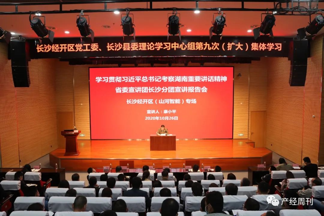 10月26日,学习贯彻习近平总书记考察湖南重要讲话精神省委宣讲团长沙分团长沙经开区(山河智能)专场宣讲报告会暨长沙经开区党工委、长沙县委理论学习中心组第九次(扩大)学习会在山河工业城举行。